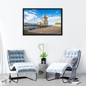 This photographic canvas depicts Belem Tower in Portugal set against a peaceful coastal scene with ocean, sky, and a sandy shore. A low-angle, rule-of-thirds composition highlights the tower and nearby wooden bridge, while a lone figure on the beach adds scale. It works well in coastal, travel, or historic-themed rooms and modern wall decor.