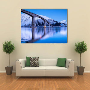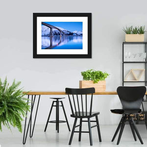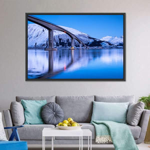A photorealistic landscape of an arched bridge with snow-covered peaks mirrored in calm water. Rendered in cool blues, whites, and grays, the scene feels serene, majestic, and quietly cold. This canvas print suits modern home decor, especially living rooms and entryways.