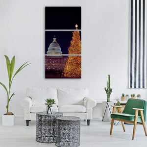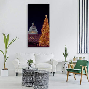 A photographic canvas of the United States Capitol building alongside a lit Christmas tree, showing the illuminated dome and a star-topped tree. The gold, white, black and red palette creates a festive, grand, majestic atmosphere that suits holiday wall decor in modern spaces.
