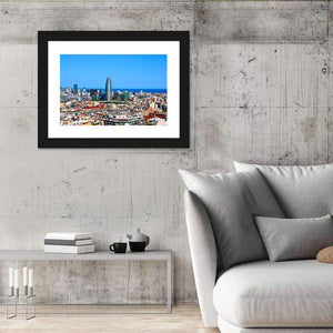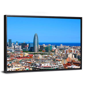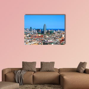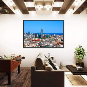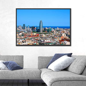 Torre Agbar and the Barcelona skyline meet the sea in a high-angle daytime cityscape. Cooler blues and grays with touches of orange and red create a bright, sunny urban mood that suits modern interiors. Use it as room decor in living rooms or contemporary offices.