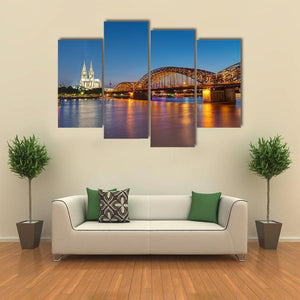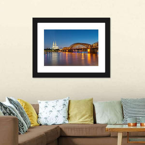 A photorealistic canvas that captures the Hohenzollern Railway Bridge at night, featuring illuminated bridge arches and the twin spires of a cathedral on the river skyline. The blue, orange, white, and yellow palette creates a vibrant, lively, iconic atmosphere, composed with a rule-of-thirds layout. Suited to modern living rooms or offices as cityscape wall decor.