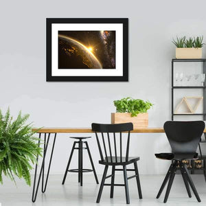 This artwork showcases a breathtaking view of Earth under a magnificent sunrise. The vastness of space and the details of city lights plus the Milky Way create a serene and awe-inspiring atmosphere.