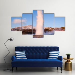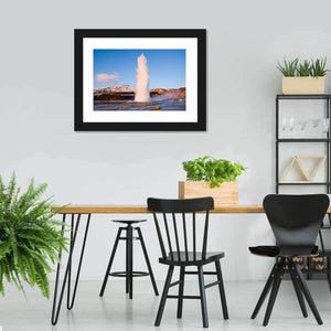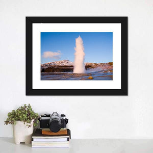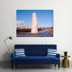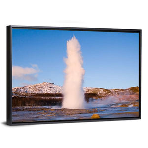 Experience the breathtaking eruption of a geyser amidst snow-capped hills and a bright blue sky. This photorealistic canvas captures nature's dramatic beauty, making it a striking addition to any space.