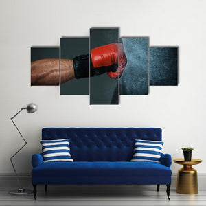 A close-up action shot of a boxing glove striking a punching bag, with dust particles suspended in the air and a red, black and gray palette that reads intense and powerful. This modern, dramatic canvas print suits contemporary homes and sporty rooms like a home gym or living area.