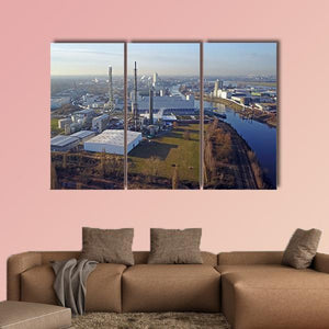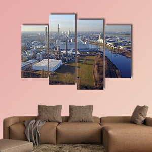 Harbour of Krefeld, Germany shows an aerial view of an industrial complex with smokestacks, canals and train tracks. Cool blues, grays, greens and whites create a restrained, industrial mood. This canvas print fits modern, industrial-style rooms such as lofts or offices seeking urban landscape art.