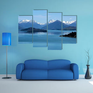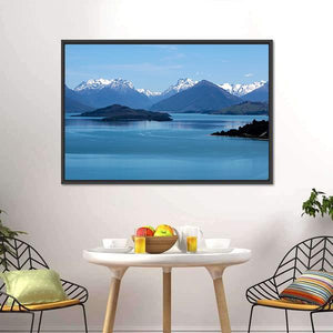 This landscape artwork captures the serene beauty of snow-capped mountains and a tranquil lake dotted with small, forested islands. The calm blue and green palette evokes a sense of vastness and peace, making it a perfect addition to any nature-inspired décor.