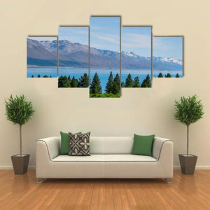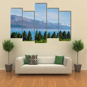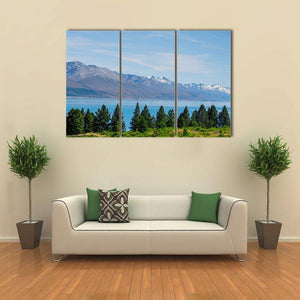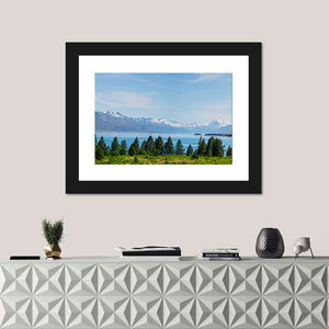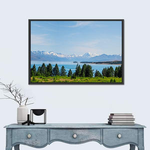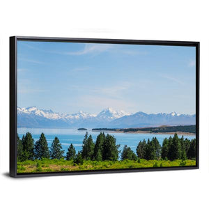 Mt Cook sits beside a calm lake, framed by pine trees and snow-capped peaks under a clear blue sky. The realistic landscape conveys a serene, majestic mood in cool blues, greens, gray, and white. It pairs naturally with modern or nature-inspired room decor.