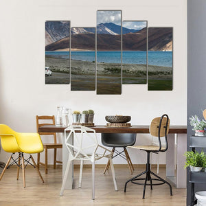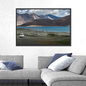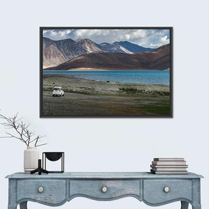 This canvas features a serene landscape of Pangong Lake, framed by majestic mountains and a rocky shoreline. The natural colors evoke a sense of vastness, making it a beautiful addition to any room.