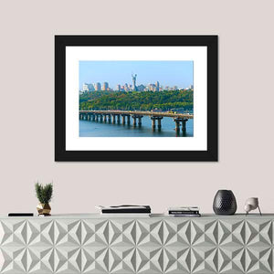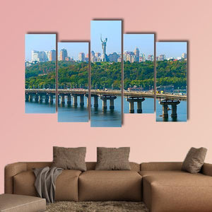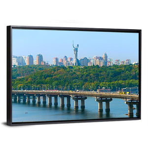 Paton Bridge Over The River Dnieper shows a realistic cityscape of a bridge with cars, a city skyline, and a distant hilltop statue under a clear daytime sky; the scene reads bright and serene. Rendered in blue, green, grey and white, this canvas print suits modern homes and living rooms as calm wall decor.