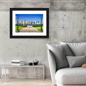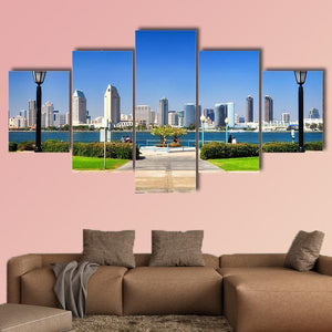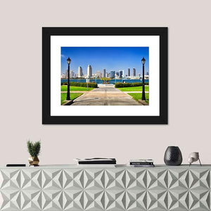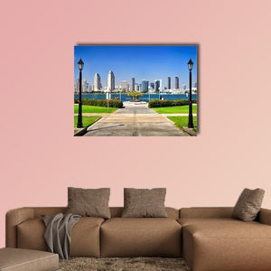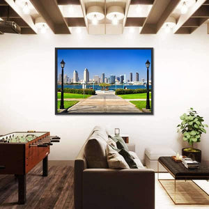 This photorealistic canvas shows a San Diego city skyline viewed from a waterfront park, with a paved walkway and symmetrical street lamps leading toward the horizon. A blue, green and grey palette under a clear daytime sky creates a calm, bright, urban scenic mood. It works well in modern living spaces as understated wall decor.