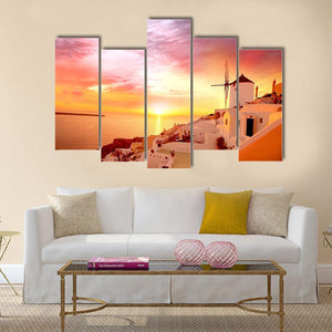 This canvas wall art features a picturesque sunset over a serene Santorini village, highlighted by a classic windmill against a dramatic sky. Ideal for bringing a touch of romance to your space.