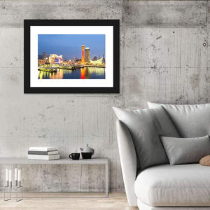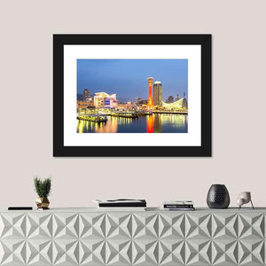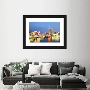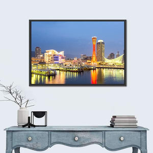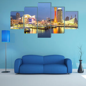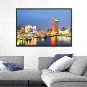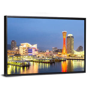 A modern cityscape of Kobe’s port and skyline at twilight, showing an illuminated tower and waterfront buildings. Colorful lights and water reflections create a vibrant, lively urban atmosphere. Works well in modern living rooms or offices as contemporary room decor.