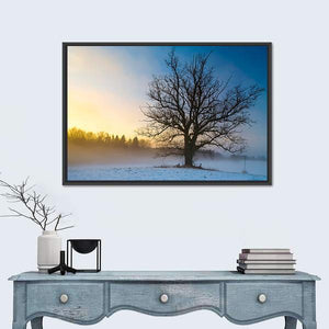 Snow Covered Tree Canvas Wall Art shows a lone bare tree standing in a snow-covered field at sunrise, with sunlight breaking through fog and a cool blue-and-yellow palette that reads peaceful and quiet. This realistic landscape print fits modern interiors and provides a calm, early-morning mood for room decor.