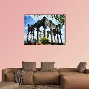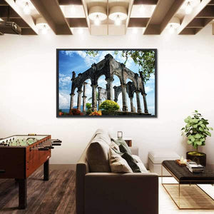 Soekasada Architecture In Indonesia Canvas Wall Art shows ruined architecture — arches and columns rising among trees under a broad sky, rendered in a realistic, low-angle wide composition. A palette of blues, grays, greens and browns gives the scene a historic, serene, majestic mood and makes the print a calm focal piece for blue-gray or earthy interiors.