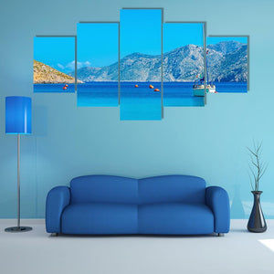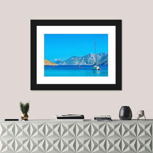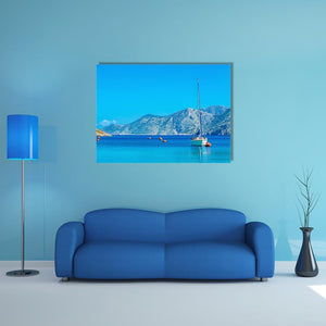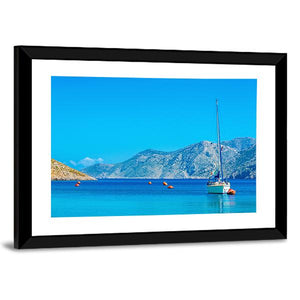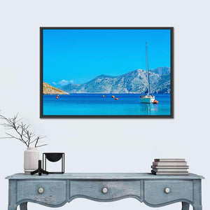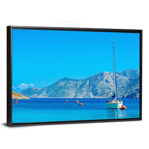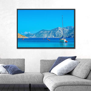 This canvas art features a serene sailboat floating in clear blue water, framed by majestic mountains on a Greek island. Its tranquil palette of blues and greens brings a peaceful vibe to any space.
