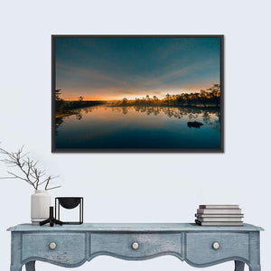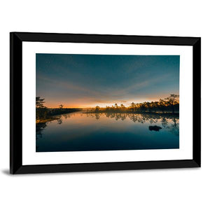 This canvas shows a quiet swamp lake with trees and stars reflected in the water, rendered in blues, teal and warm orange against black for a calm night scene. The rule-of-thirds composition gives a balanced, serene feel that fits modern home décor, especially living rooms and bedrooms with nature-inspired accents.