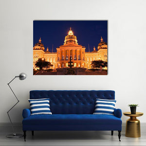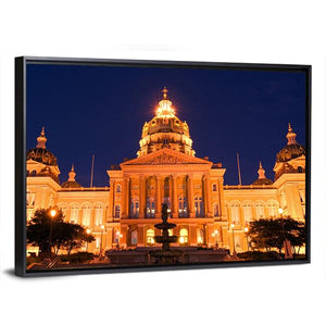 This striking artwork features the illuminated dome of the State Capitol in Des Moines, capturing the grandeur of the government building against a dark blue sky. Its formal mood and symmetrical composition make it perfect for a sophisticated home or office decor.