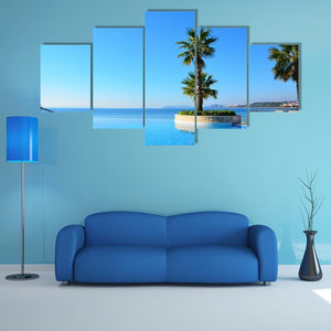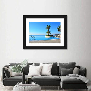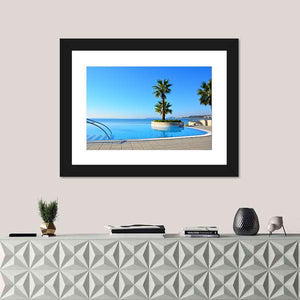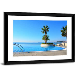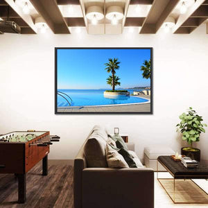 This canvas wall art features a serene scene of an infinity pool bordered by palm trees and the ocean. The calming blue and green palette evokes a tropical, luxurious atmosphere, perfect for brightening any space.