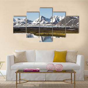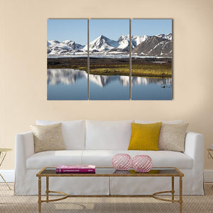 This canvas art showcases a serene Arctic summer landscape, featuring majestic snow-capped mountains mirrored in a tranquil lake. The lush green tundra and hints of glacier detail invite a sense of peace into your space.