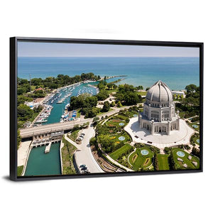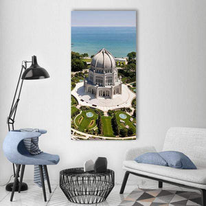 Aerial view of the Baháʼí House of Worship in Wilmette, Illinois, centered on its domed architecture with formal gardens and a lakefront backdrop. Rendered photorealistically in blues, greens, whites, and grays, the image conveys a serene, grand mood that suits modern or tranquil interiors.