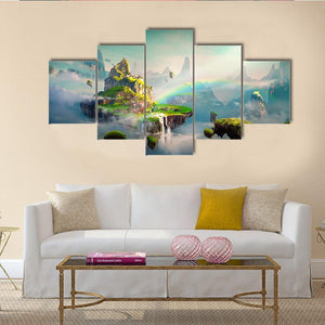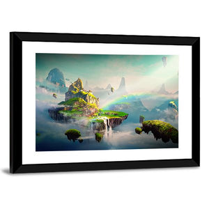 View Of Island Canvas Wall Art presents a layered fantasy landscape of floating islands, cascading waterfalls, and a small village on the main island. Soft greens, blues, white, gold and pink, with sunbeams and a rainbow, create a serene, magical atmosphere that suits modern or fantasy-inspired rooms.