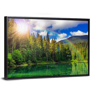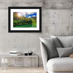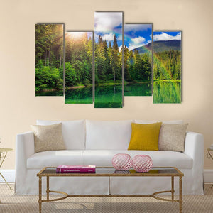 A realistic landscape of a mountain lake beside an evergreen pine forest, with sunlight streaming through the trees and a clear reflection on the water. Greens, blues and warm yellow sunbursts give the scene a vibrant, serene, majestic mood. Works well as room decor in living rooms or modern spaces that seek calm nature imagery.