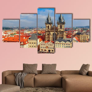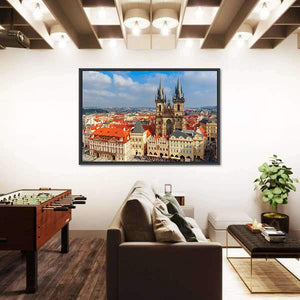 This canvas shows a view over the Church of Our Lady in Prague, featuring old buildings, red-tiled roofs and a Gothic church with two prominent spires. The photorealistic image uses red, white, brown, blue and grey to create a vibrant, historic European mood. It works well as wall art for living rooms, hallways or dining areas with classic or modern decor.