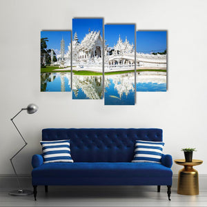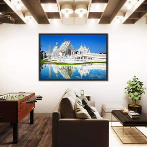 Experience the serenity of Wat Rong Khun Temple in Chiang Rai through this striking canvas art. With its ornate white structure mirrored in calm blue waters, this piece brings a touch of tranquility to any space.