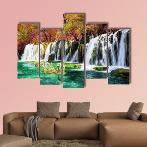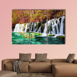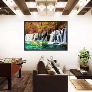 This canvas shows a waterfall and an azure lake in China, surrounded by lush forest and autumnal trees with vibrant turquoise water. The realistic, colorful palette of greens, blues, whites and warm browns creates a serene, natural vibe that works well in living rooms or modern rooms as a calm focal piece.