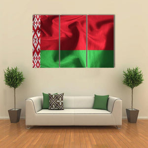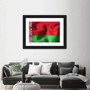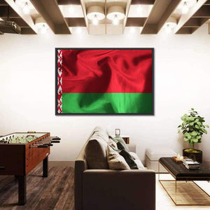 This canvas print features the waving flag of Belarus with a nationalistic, proud mood. Rendered in red, green and white with a graphic, rule-of-thirds composition and an ornamental border pattern that suggests draped fabric folds, it fits modern house and room decor.