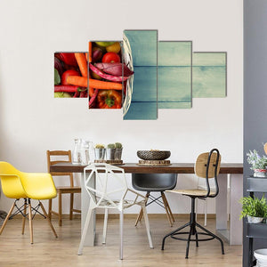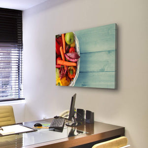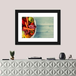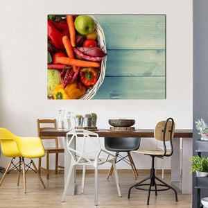 This vibrant canvas features a close-up, top-down view of a white wicker basket filled with colorful vegetables. The fresh array of greens, oranges, reds, and yellows creates a healthy and uplifting atmosphere, perfect for brightening any space.