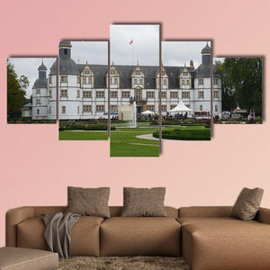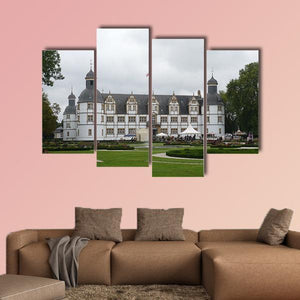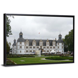 White Castle in Paderborn, Germany sits centered on a wide green lawn, its domed towers and roof flags rising beneath an overcast summer sky. The symmetrical composition and a restrained palette of green, white, grey and brown give the scene a grand, stately mood that fits modern wall decor and room decor.