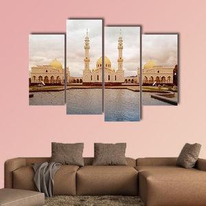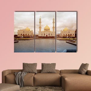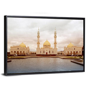 A photorealistic landscape showing a white mosque in Tatarstan, Russia with golden domes and minarets reflected in calm water. The symmetrical composition and a white, gold, blue, and grey palette create a serene, majestic, peaceful atmosphere. Suited to modern interiors and room decor that favor architectural, calming imagery.