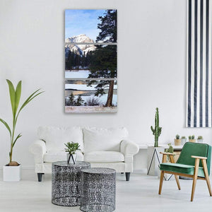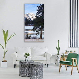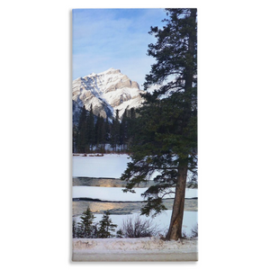 Banff winter landscape with a snow-capped mountain, pine trees, and a frozen river set in a serene, peaceful winter mood. Sunlight reflects on the water near a large pine in the foreground, rendered in cool blues and whites with green and brown accents. A calm choice for nature-inspired or rustic rooms.