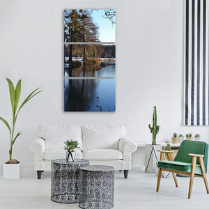 Black Forest In Winter, Germany shows a calm winter landscape of bare trees beside a still lake with crisp reflections. The realistic scene uses blue, brown, white, and gray tones with snow on the ground for a serene, tranquil feel. Suits modern or nature-inspired rooms and bedrooms looking for subtle nature decor.