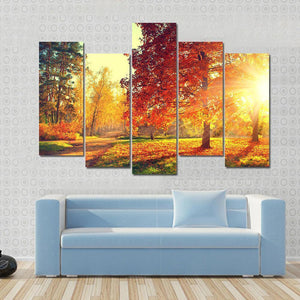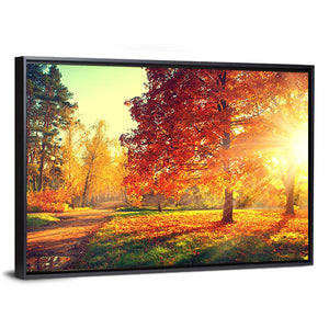 This landscape art captures the serene beauty of autumn trees basking in golden sunlight. With a warm palette of orange and yellow, it invites a peaceful atmosphere to any space.