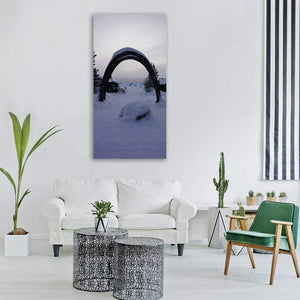 A realistic snowy landscape of the Ice Hotel in Sweden, centered on a large arch and a rock, framed by bare trees with small buildings in the background. The cold, serene, isolated mood and a muted palette of blue, white, gray, and brown make it a calm focal point for modern or nature-inspired rooms.