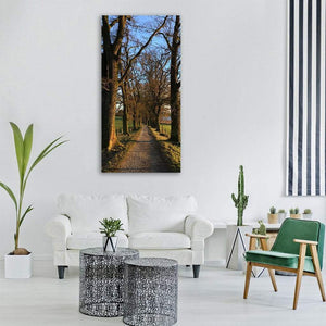 A realistic landscape of a tree-lined path through the countryside on a sunny winter day, showing bare trees and a gravel path that leads into the distance. The palette of browns, greens, blues and grays creates a serene, natural mood that works well in modern or nature-focused rooms and simple wall decor.