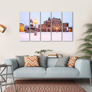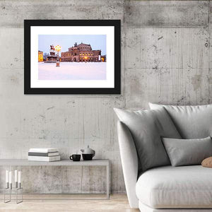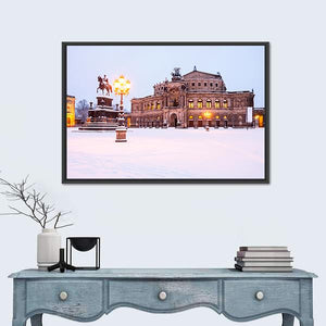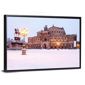This canvas wall art captures the majestic Semperoper opera house enveloped in serene winter snowfall. The artwork features a charming scene with a horseback statue and ornate street lamps, all beautifully illuminated. Ideal for adding a touch of tranquility to your space.