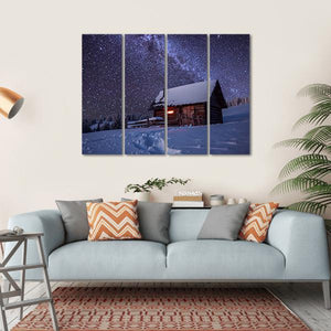This enchanting canvas print features a log cabin nestled in a serene, snowy landscape beneath a breathtaking night sky. The majestic Milky Way glimmers above, creating a wondrous and peaceful atmosphere that beautifully enhances any space.