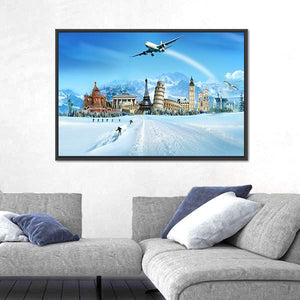 This landscape artwork captures a whimsical scene of a snowy mountain range adorned with famous landmarks like the Eiffel Tower and Big Ben. Dreamlike and adventurous, it inspires travel and exploration.