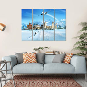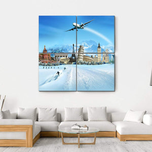 This canvas features a dreamy landscape of international landmarks and snowy mountains, perfectly capturing the beauty of travel. A colorful rainbow arcs over iconic structures like St. Basil's Cathedral and the Eiffel Tower, evoking a serene, surreal atmosphere.