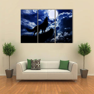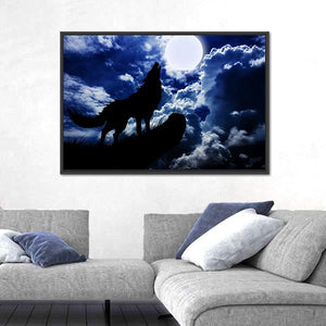 This striking canvas art features a silhouette of a wolf howling at a full moon against a dramatic night sky filled with fluffy clouds. The mysterious and solitary atmosphere makes it a captivating addition to any space.