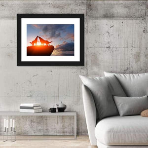 This canvas wall art captures two wolves howling against a dramatic sunset on a rocky cliff. The powerful silhouettes and vibrant colors create a majestic and wild atmosphere, making it a striking addition to any space.