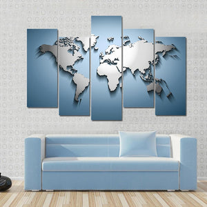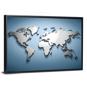This modern canvas art features a striking world map in a clean blue, white, and gray palette. Its unique embossed texture and depth create an informative and visually engaging piece for any wall.
