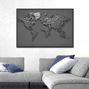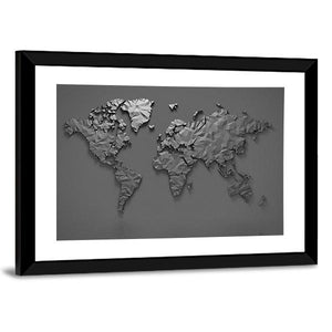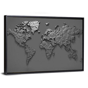 A centered world map rendered in origami-style facets, with three-dimensional texture in a gray and black palette. The geometric, modern composition makes a subtle, textured focal point that suits modern homes and living spaces as wall decor.
