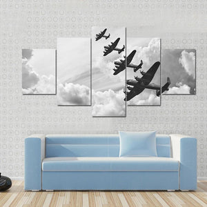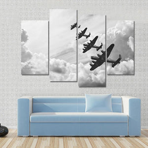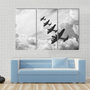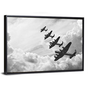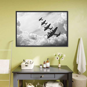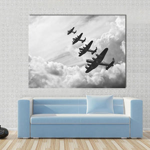 This canvas art features multiple bomber planes in a powerful formation, soaring through fluffy clouds. The dramatic monochrome palette of black, white, and gray evokes a sense of historic significance, making it an impactful addition to your wall decor.