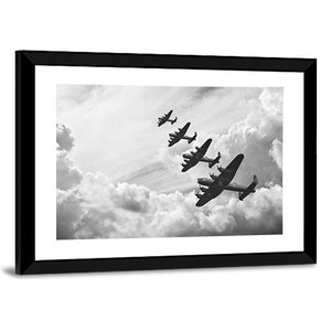 Experience the drama of airborne bomber planes with this striking canvas wall art. Rendered in a vintage photographic style, the artwork captures formation flying amidst a backdrop of clouds and sky in monochrome tones. It's a remarkable piece that brings a historic touch to any space.