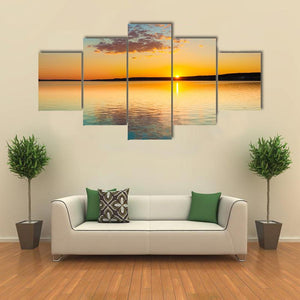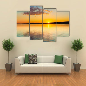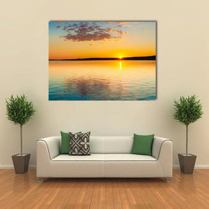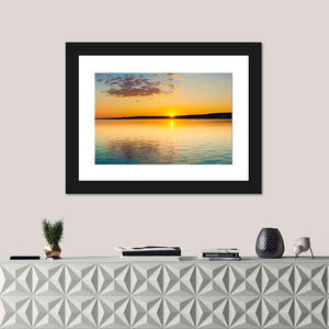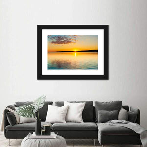 Sunset Over Sea depicts a sun setting on the horizon above calm water, with clouds reflected in the surface. Warm oranges, cool blues and soft yellows give the scene a serene, peaceful feeling. The photorealistic landscape suits modern homes and living rooms as understated room decor.