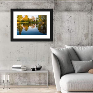 A calm lakeside scene featuring trees mirrored in still water, a small building on a hill, and a culvert under the embankment. The blue, green, yellow and brown palette and symmetrical composition create a serene, natural mood that suits modern or nature-inspired rooms.